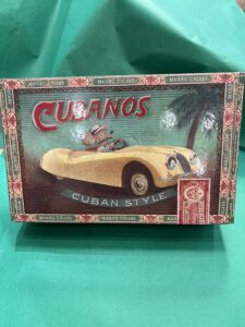 Maileg – Oma & Opa Maus wohnen in der Zigarrenschachtel in einem gemütlichem Bett mit Matratze, Kopfkissen und Steppdecke. Oma hat ein Blümchennachthemd an und trägt aber noch ihre Schuhe im Bett! Nanu? Und der Opa trägt zu seinem karierten Schlafanzug noch seine Strümpfe und Schnürschuhe. Wahrscheinlich wollen beide gleich mit dem schnittigen Auto losfahren, das auf der Zigarrenschachtel zu sehen ist. Gute fahrt ihr beiden!