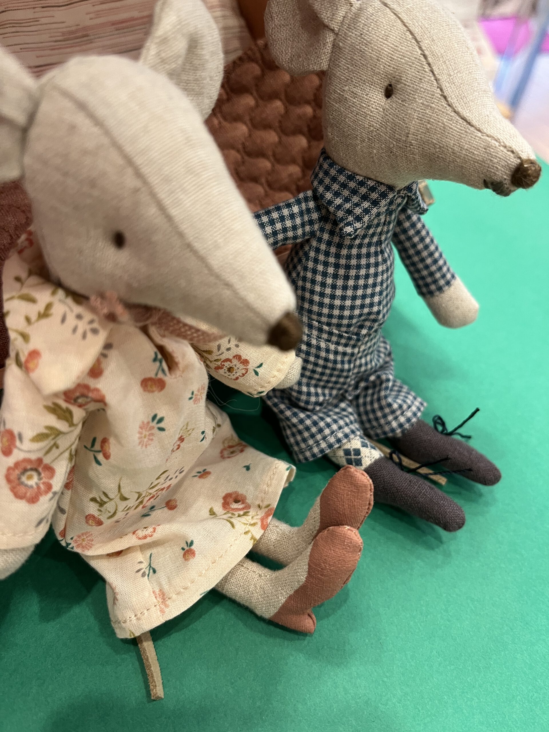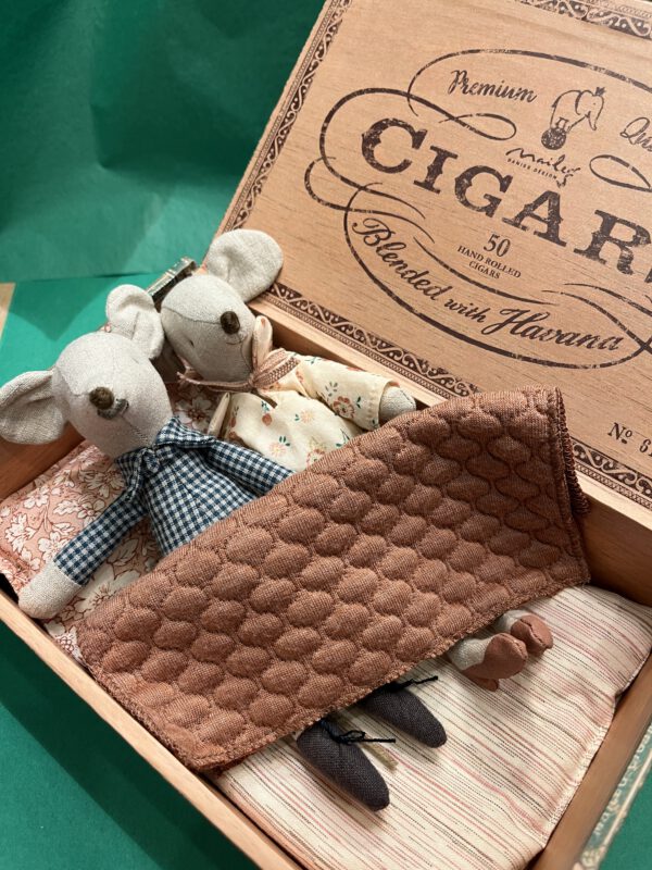 Maileg – Oma & Opa Maus wohnen in der Zigarrenschachtel in einem gemütlichem Bett mit Matratze, Kopfkissen und Steppdecke. Oma hat ein Blümchennachthemd an und trägt aber noch ihre Schuhe im Bett! Nanu? Und der Opa trägt zu seinem karierten Schlafanzug noch seine Strümpfe und Schnürschuhe. Wahrscheinlich wollen beide gleich mit dem schnittigen Auto losfahren, das auf der Zigarrenschachtel zu sehen ist. Gute fahrt ihr beiden!